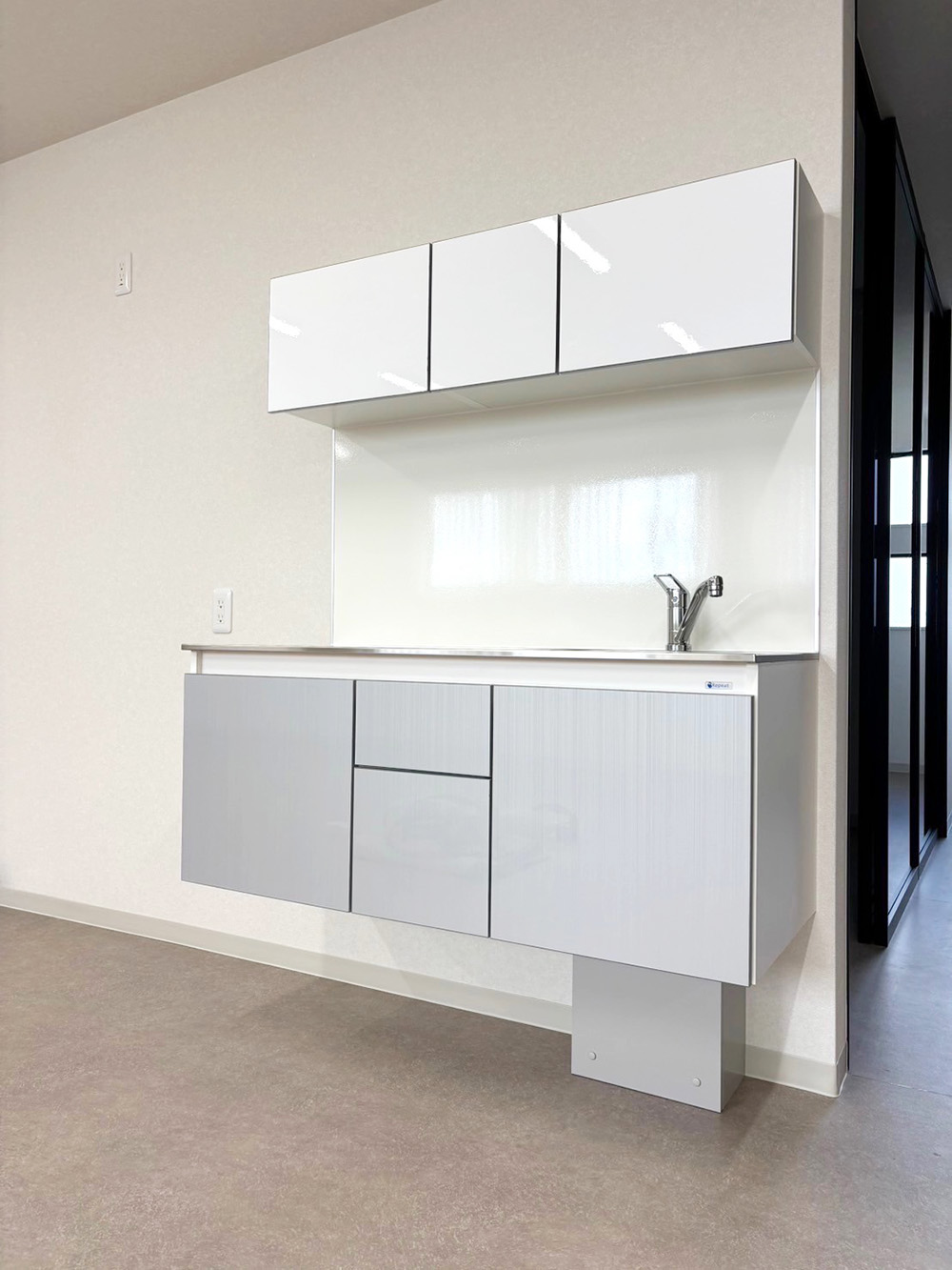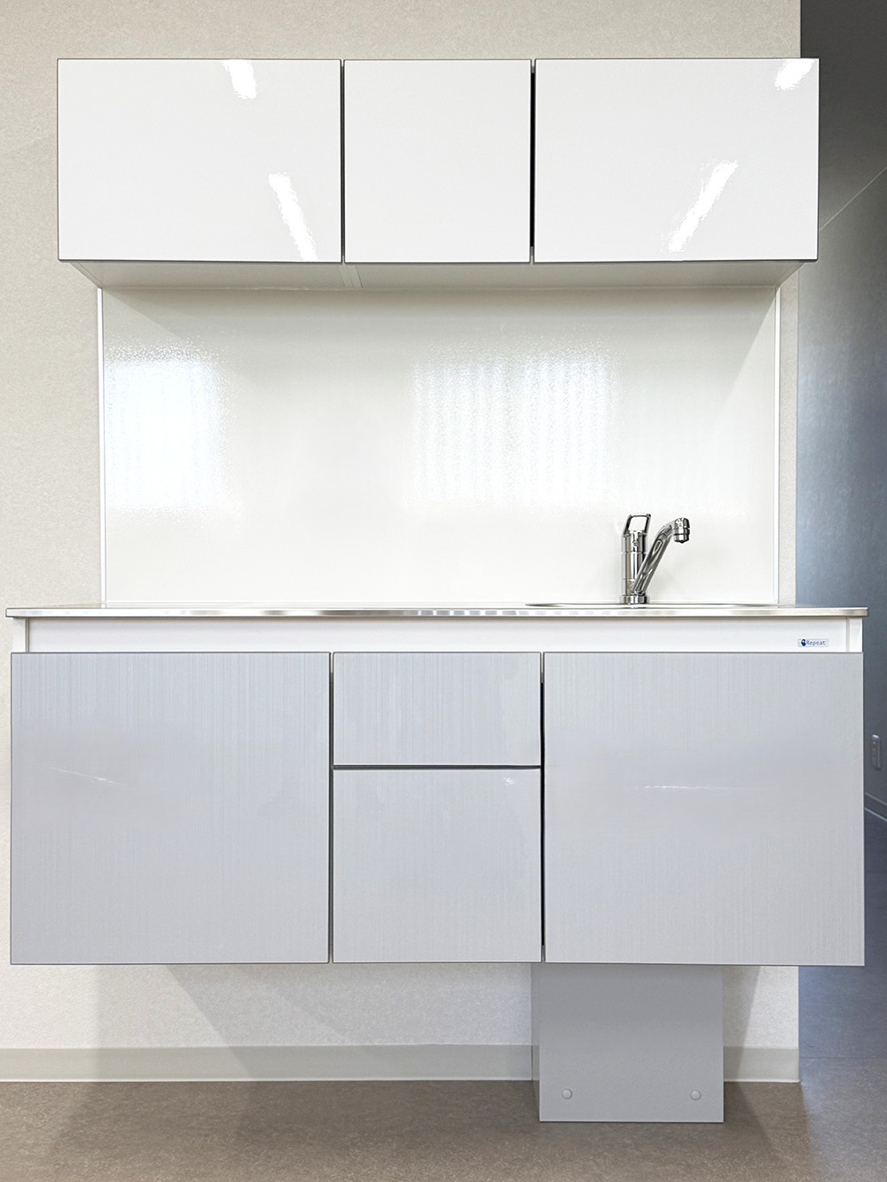 吊戸棚にはホワイト、キャビネットにはメタリックカラーをチョイスすることで、