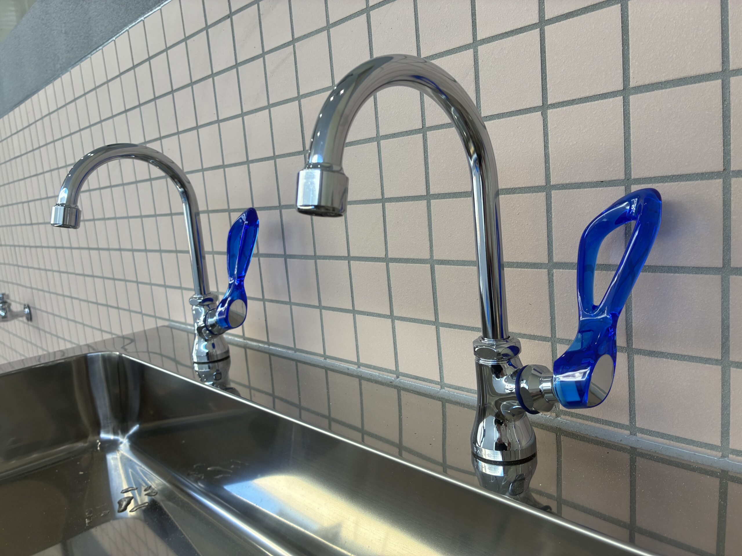 水栓は単水栓をベースに、グースネックの水栓パイプと、大型のレバーハンドルを組み合わせ、